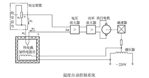 如果將控溫過程中的人工操作 (檢測和調(diào)節(jié)) 換由自動控制裝置完成,則成為包裝機自動控溫系統(tǒng)。如下圖所示,檢測元件熱電偶檢測恒溫箱內(nèi)的溫度,并將溫度轉(zhuǎn)換為對應(yīng)的電壓信號2 ,同時反饋給比較器。比較器比較表示給定溫度的給定電壓信號1與檢測電壓信號2的大小,得到溫差信號,其大小和正負代表溫差的大小和方向。溫差信號△經(jīng)電壓放大和功率放大后,控制執(zhí)行電機的轉(zhuǎn)速和方向,執(zhí)行電機通過傳動裝置拖動調(diào)壓器觸頭調(diào)節(jié)供熱電壓。當溫度偏高時,動觸頭向著減小電壓( 電流)方向轉(zhuǎn)動; 反之,當溫度偏低時,動觸頭則向著增大電壓( 電流)方向運動,直至恒溫箱內(nèi)溫度達到給定溫度,溫差信號△=0 時觸頭停止運動。